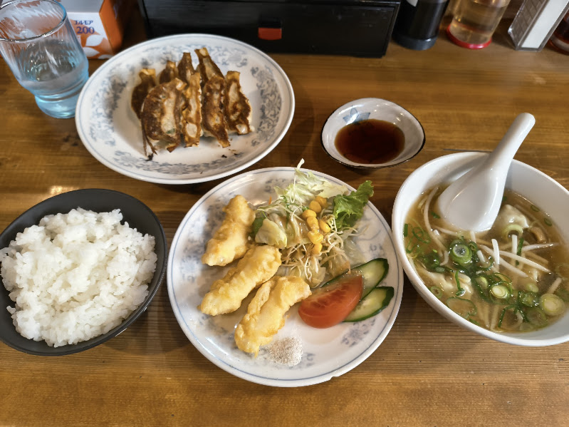 イカの天ぷら・ワンタンメン・餃子・ライスという