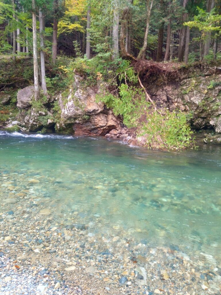 山間部の透き通る川沿いを走りながら、