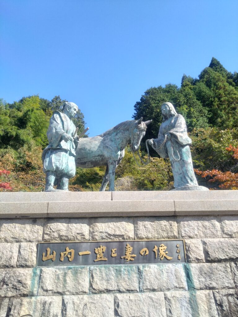 郡上八幡城に到着しまして、何故か、功名が辻󠄀で有名な山内一豊とその妻千代の像があり、